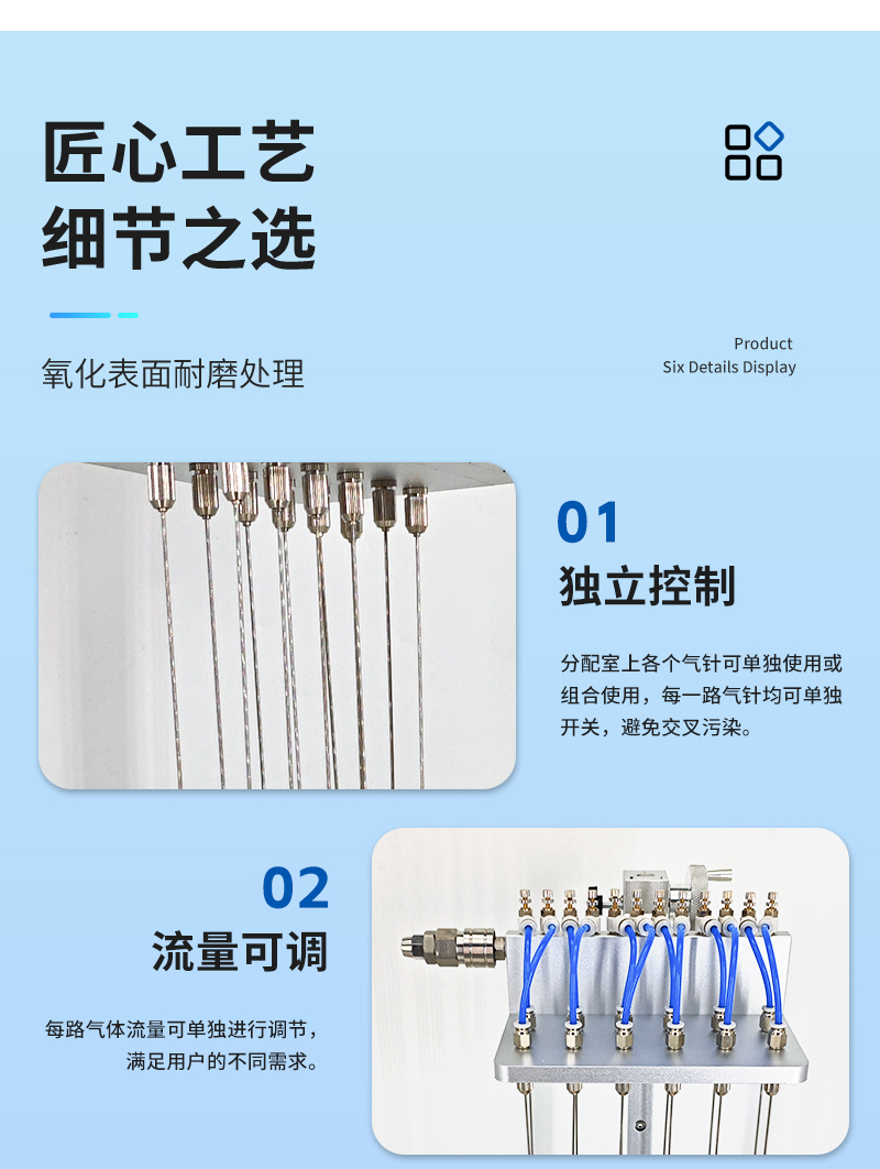2. 气针通道使用方式:分配室上各气针通道具备多样化的使用方式,既可以组合使用,也能够单独使用,并且每一路气针都可独立进行开关控制,充分满足不同实验场景对气针使用的需求。