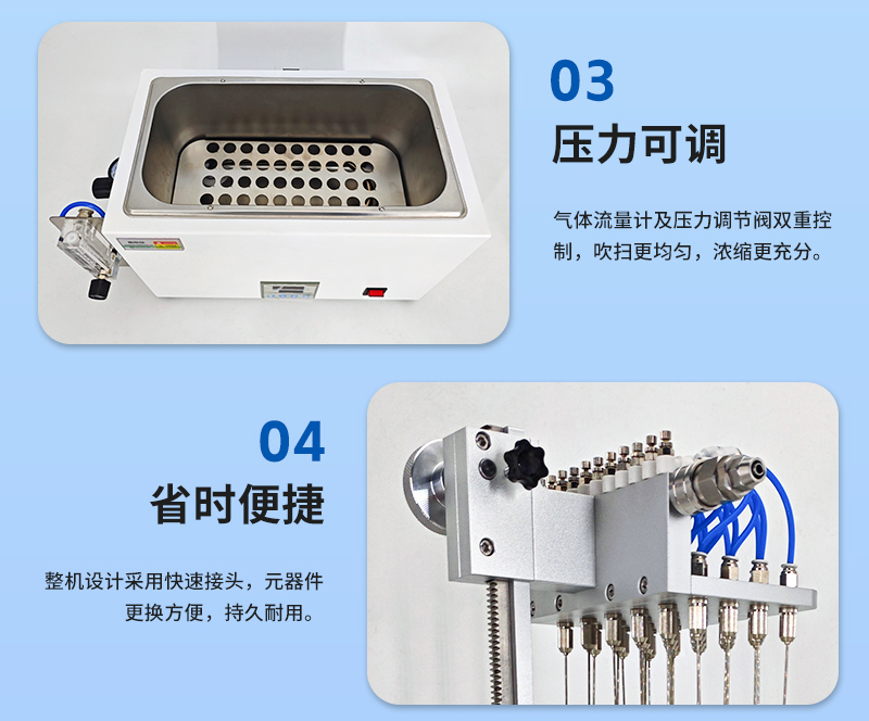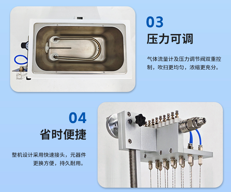 1. 浓缩通道灵活性:支持12/24位通道同时或单独进行浓缩操作,这种设计让操作方式简单且灵活,无论是批量处理样品还是单独处理特定样本,都能轻松应对。